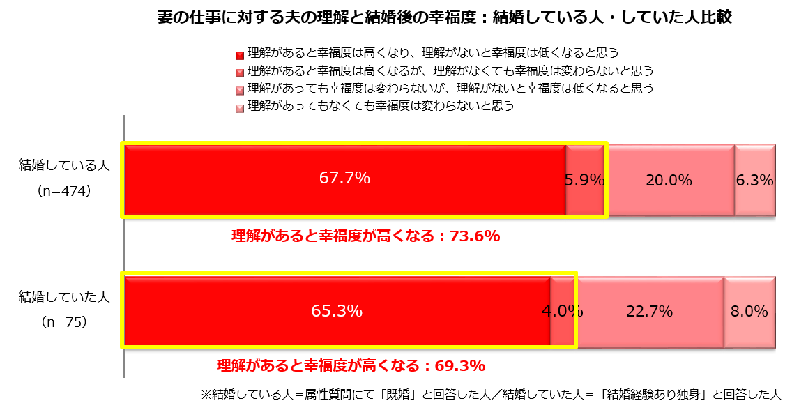 【結婚生活】結婚経験がある女性のホンネ。妻の仕事に対し夫の理解があると、結婚後の幸福度は…?「高くなる」73.0%/女性にとって仕事は、結婚の妨げになると「思う」48.6%