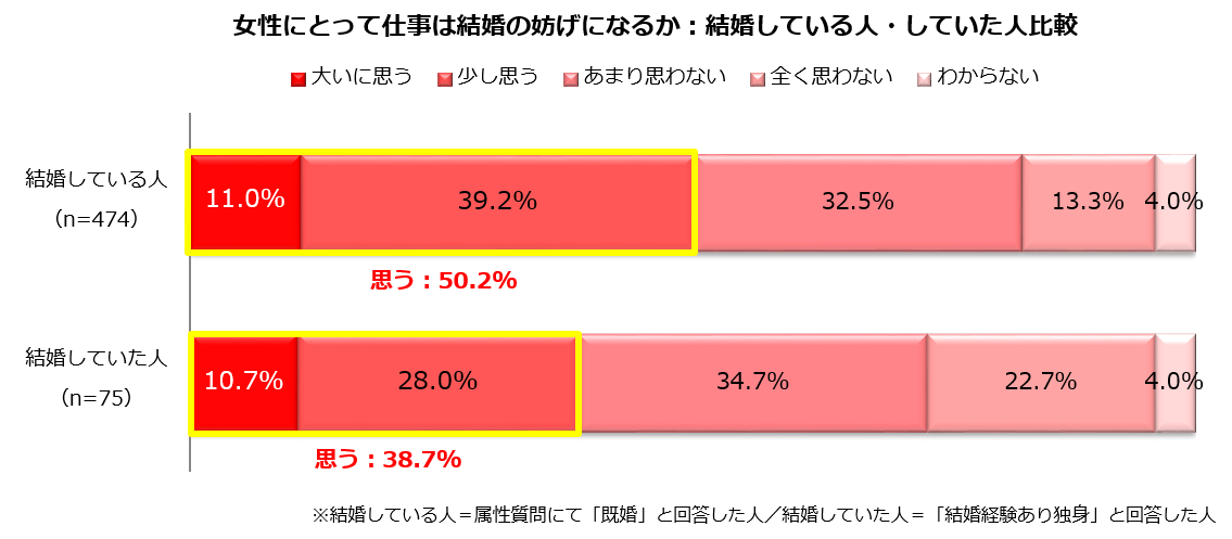 2.女性にとって仕事は結婚の妨げになるか:結婚している人・していた人比較